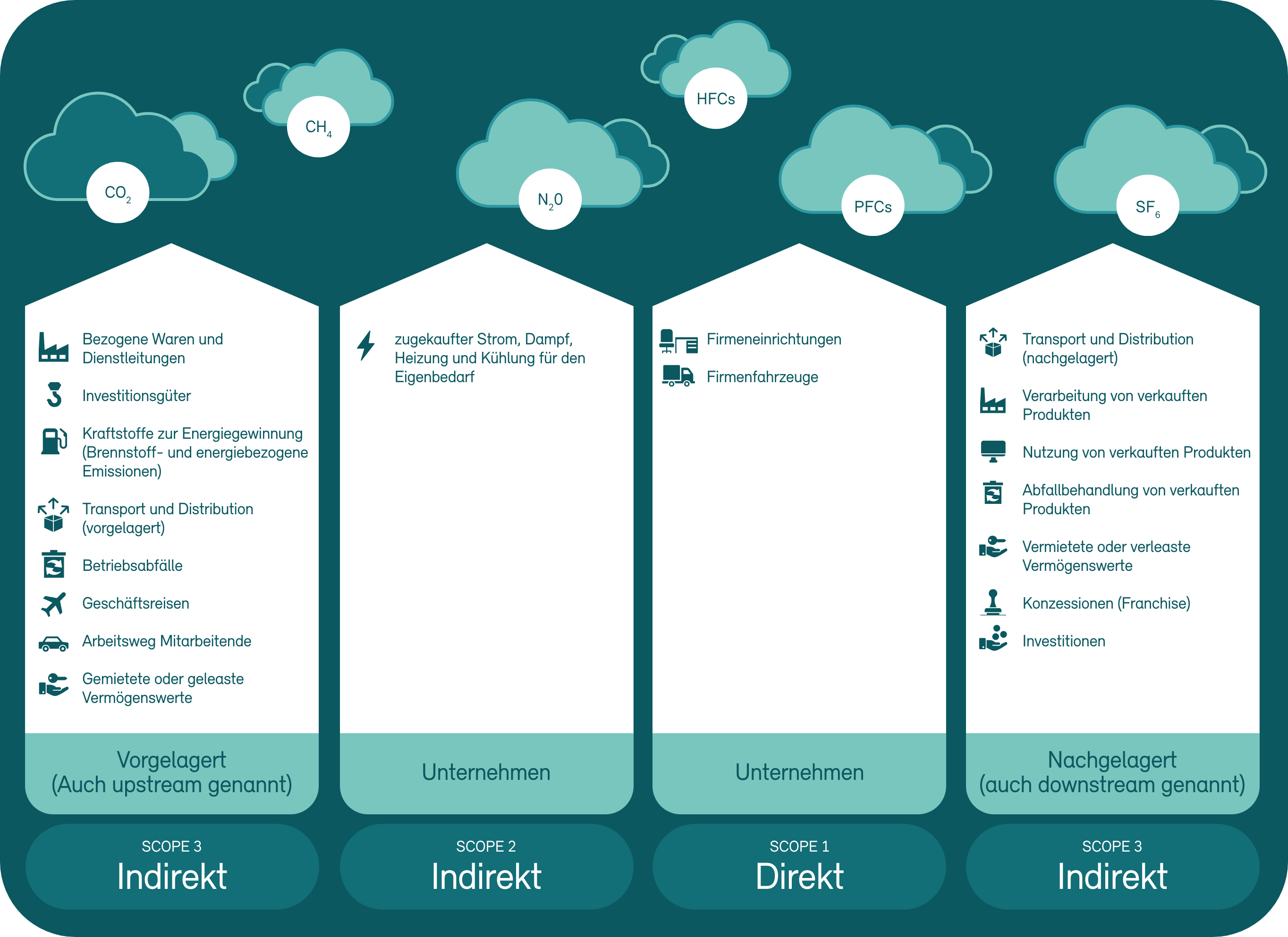 Treibhausgas-Emissionen des Unternehmens in den unterschiedlichen Scopes gemäss dem GHG-Protokoll (Greenhouse Gas Protocol) ermitteln. Dabei werden die unterschiedlichen Treibhausgase in Bezug auf ihr Global Warming Potenzial (GWP) in CO2-Äquivalente (CO2e) umgerechnet. Die Scopes stellen eine Art Checkliste dar, um alle Emissionen zu berücksichtigen: